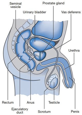 Only men have a prostate gland. The prostate is a small gland that sits below the bladder near the rectum. It surrounds the urethra (the passage in the penis through which urine and semen pass). The prostate gland is part of the male reproductive system, and produces most of the fluid that makes up semen.